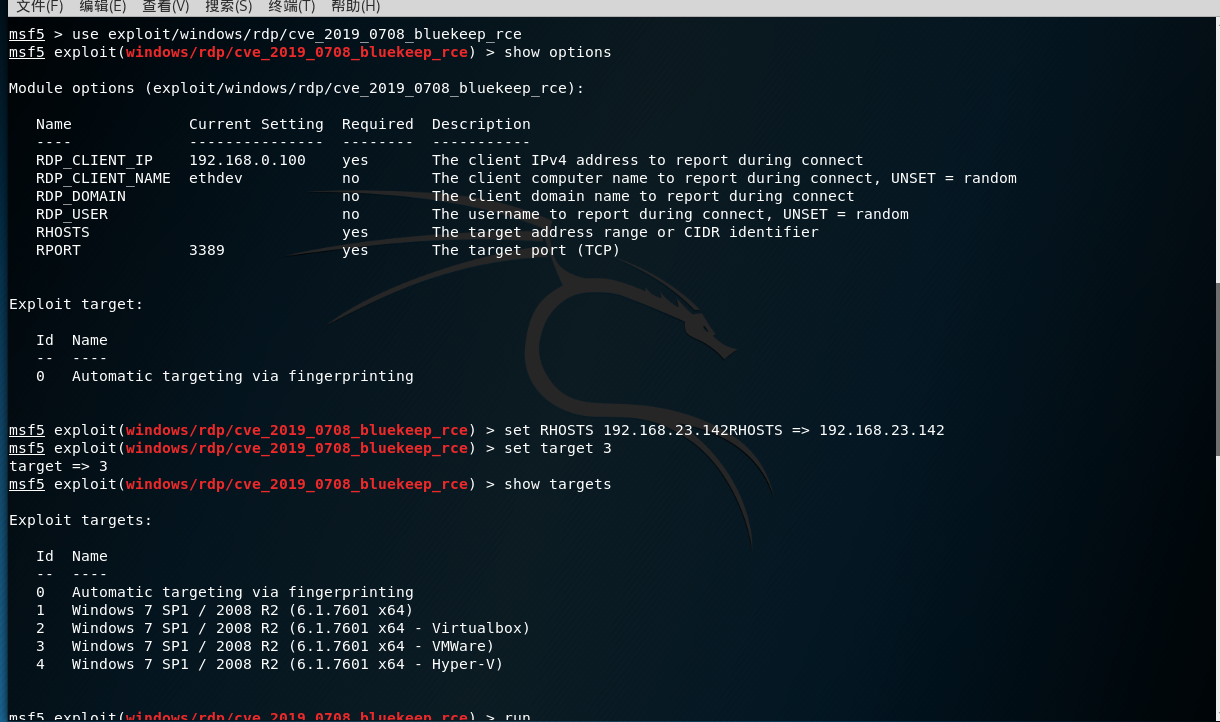 use exploit/windows/rdp/cve_2019_0708_bluekeep_rce 利用模块