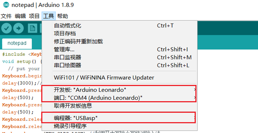 在工具下选好开发板(上图的ArduinoLeonardo)和端口,编程器选择USBasp