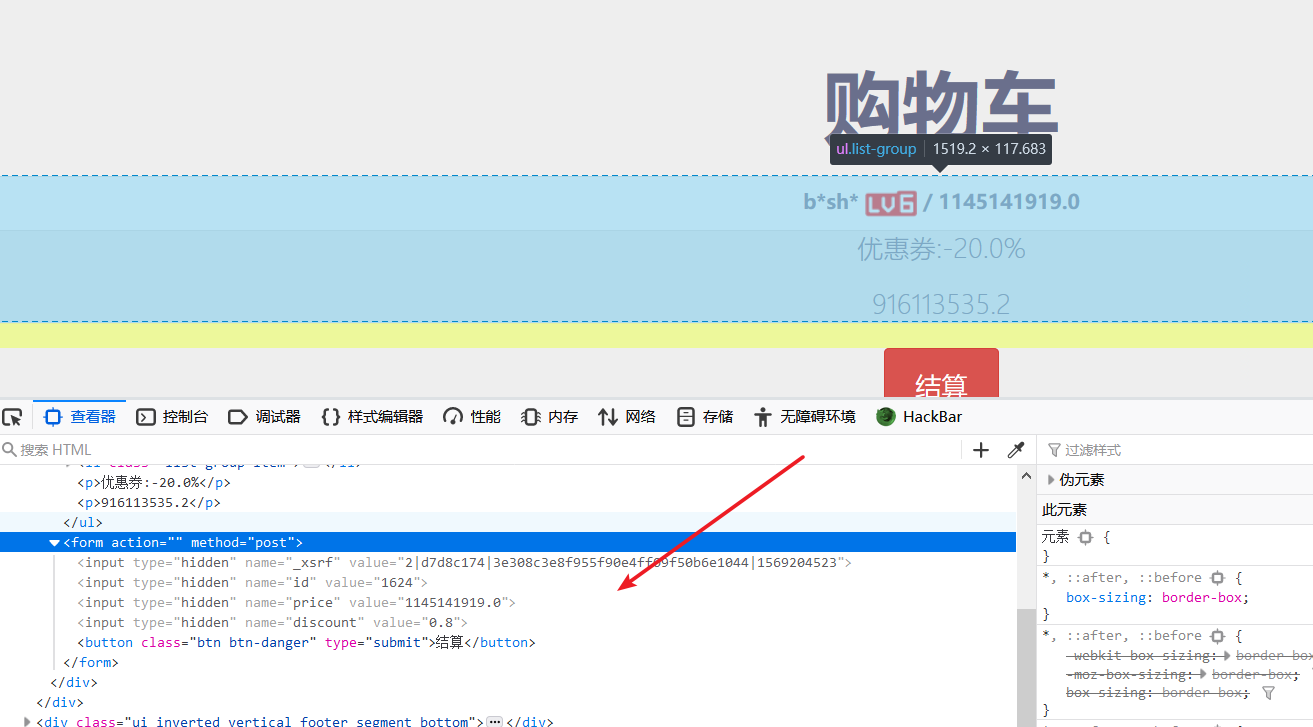 在页面中发现post表单,里面有对价格和折扣的定义。竟然前端处理,可以直接更改(也可以抓包后更改重放)。将折扣改成0.00000000000008,便可以低价购买到lv6