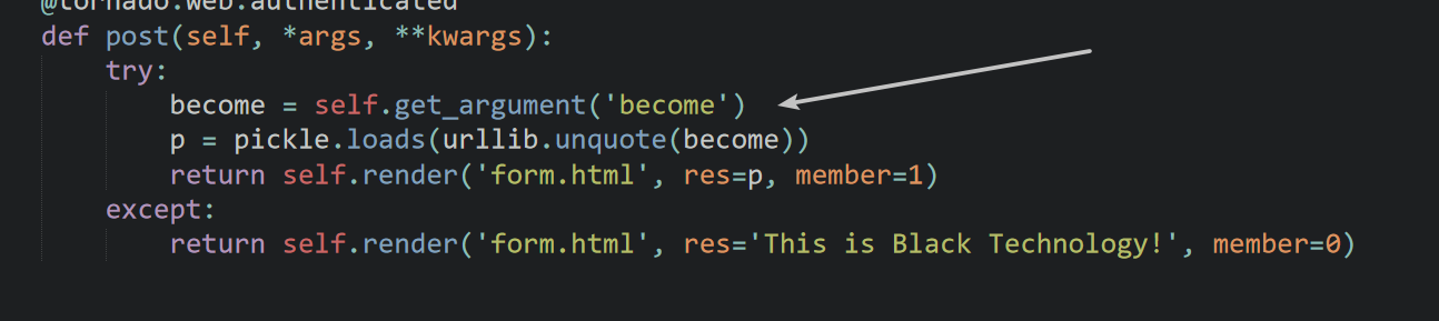 这里的Tonado框架中self.get_argument函数获取POST/GET来的become参数,并执行了pickle.loads()函数。这里就存在反序列化漏洞。
